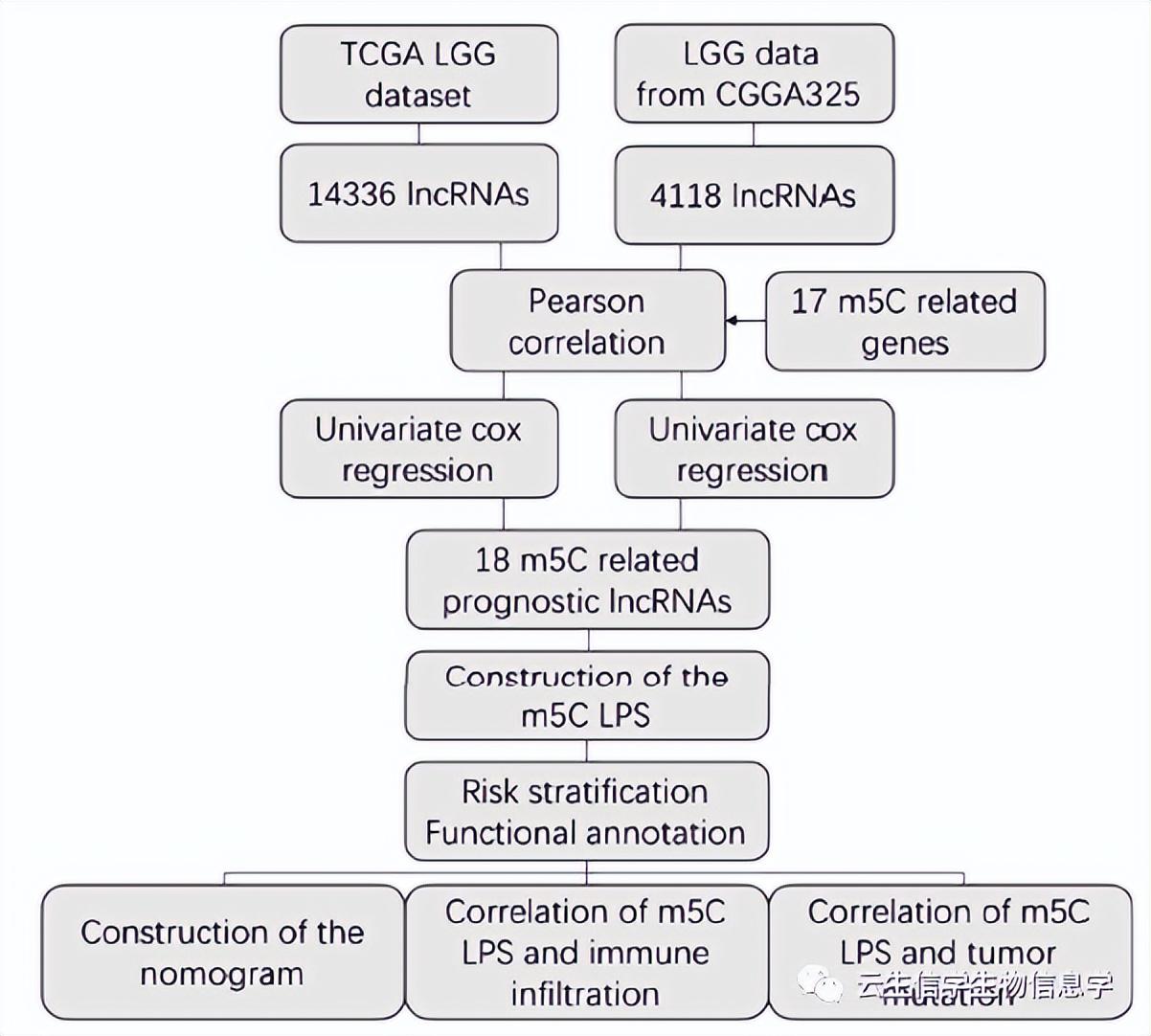 1. 分析低级别胶质瘤(LGG)患者中m5C相关lncRNA并构建预后标志(m5C LPS)