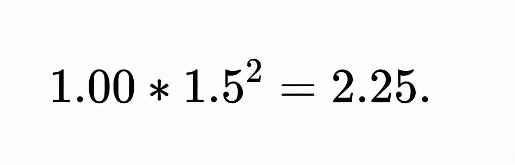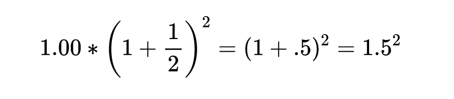 n是复利的次数。换句话说,你会在一段时间内把100%的利息分成你想要的次数。例如,在这个案例中,复利两次后,获得的本金加利息为: