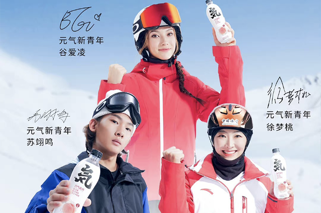 所以元气森林下功夫,了解到三位运动员的个性和经历后,将个人标签做了高度提炼,发现他们也都代表着这个时代年轻人的一种“气”。谷爱凌是热爱的朝气,苏翊鸣是不服输的傲气,徐梦桃是坚持的硬气。