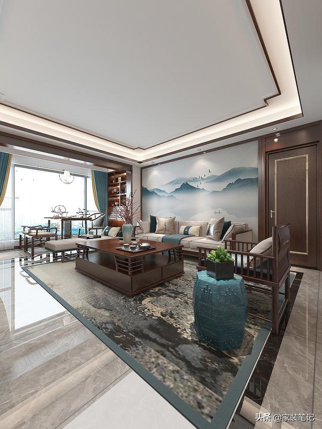 中式风格里面特别讲究的就是对称,这也比较符合我们传统的文化艺术气质。沙发背景上面有一扇门,是老人房的房门,沙发墙上面还做了一幅很有中式艺术感的山水壁画,和电视墙的大理石相呼应,形成了很好的中式格调。
