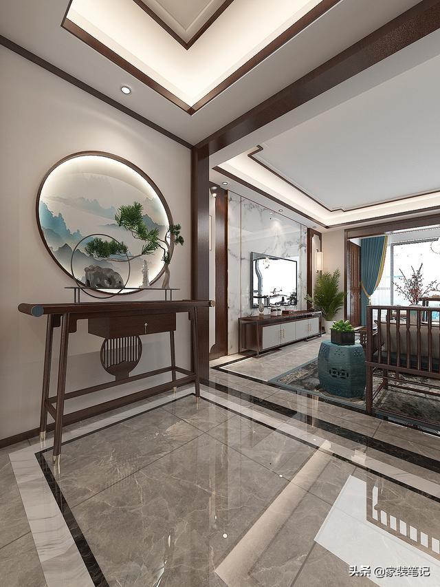 打开房门有一个很好的玄关端景,充满了中式文化、艺术感。这个玄关空间,没有实际性的作用,主要起到装饰作用,是入户很好的一处景色。在墙面做了一个圆形的造型,里面一幅山水画,通过灯光的照射,显得格外精致。