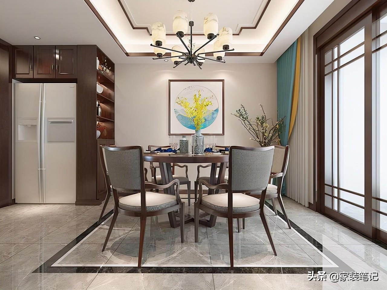 由于厨房空间不大,所以在餐厅里面做了一个柜子,刚好留出双开门冰箱的位置出来,把冰箱嵌入进去,显得更加整体一些。餐厅空间周正,摆放了圆桌,和方形的石膏板吊顶形成了“方圆之美”。