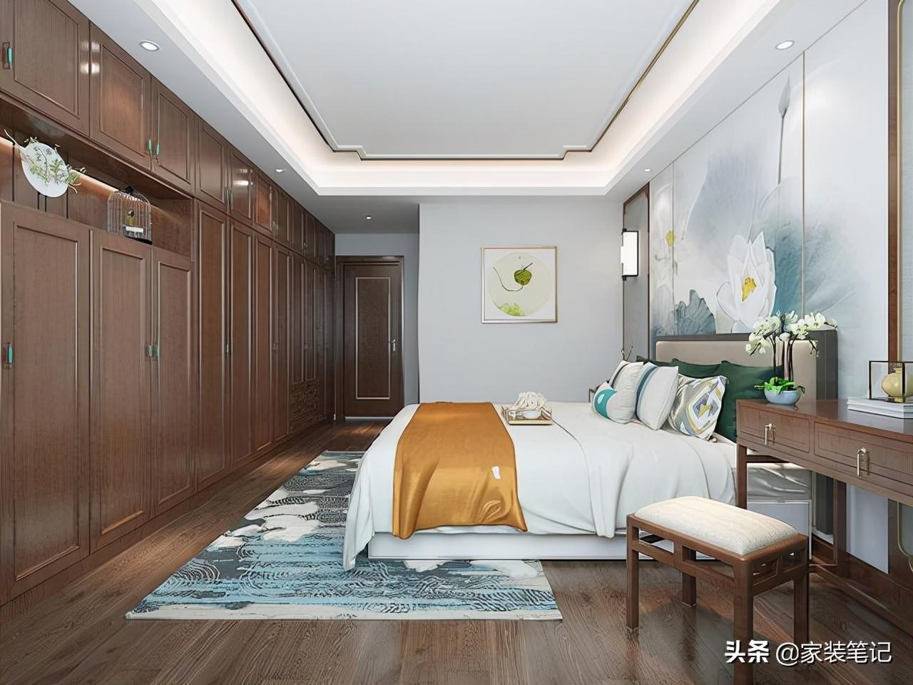 主卧室储物功能十分强大,虽然把衣帽间的面积给了小孩房,床尾一整面墙的衣柜,也足以满足业主夫妻二人的衣物收纳了。床头一幅荷花壁纸,特别有中式韵味,两边对称的壁灯更加符合中式的对称美。取消了一个床头柜,靠窗户这边摆放了一张成品的梳妆桌椅。