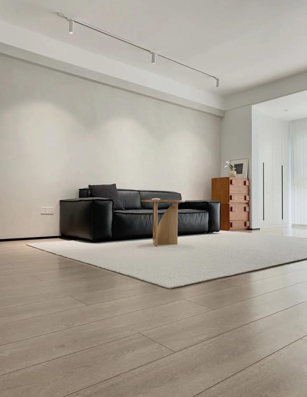 室内的地面选择的是实木复合地板,全屋通铺让地面的整体性得到了完美的展示。而沙发背景墙则简单刷了太空漫步的乳胶漆,并没有做太复杂的造型,也没有挂传统的装饰画。极简的背景墙,显得格外干净利索。