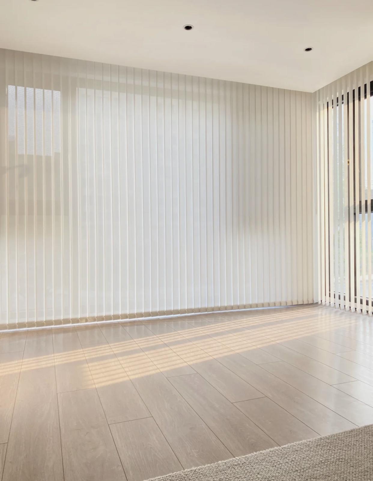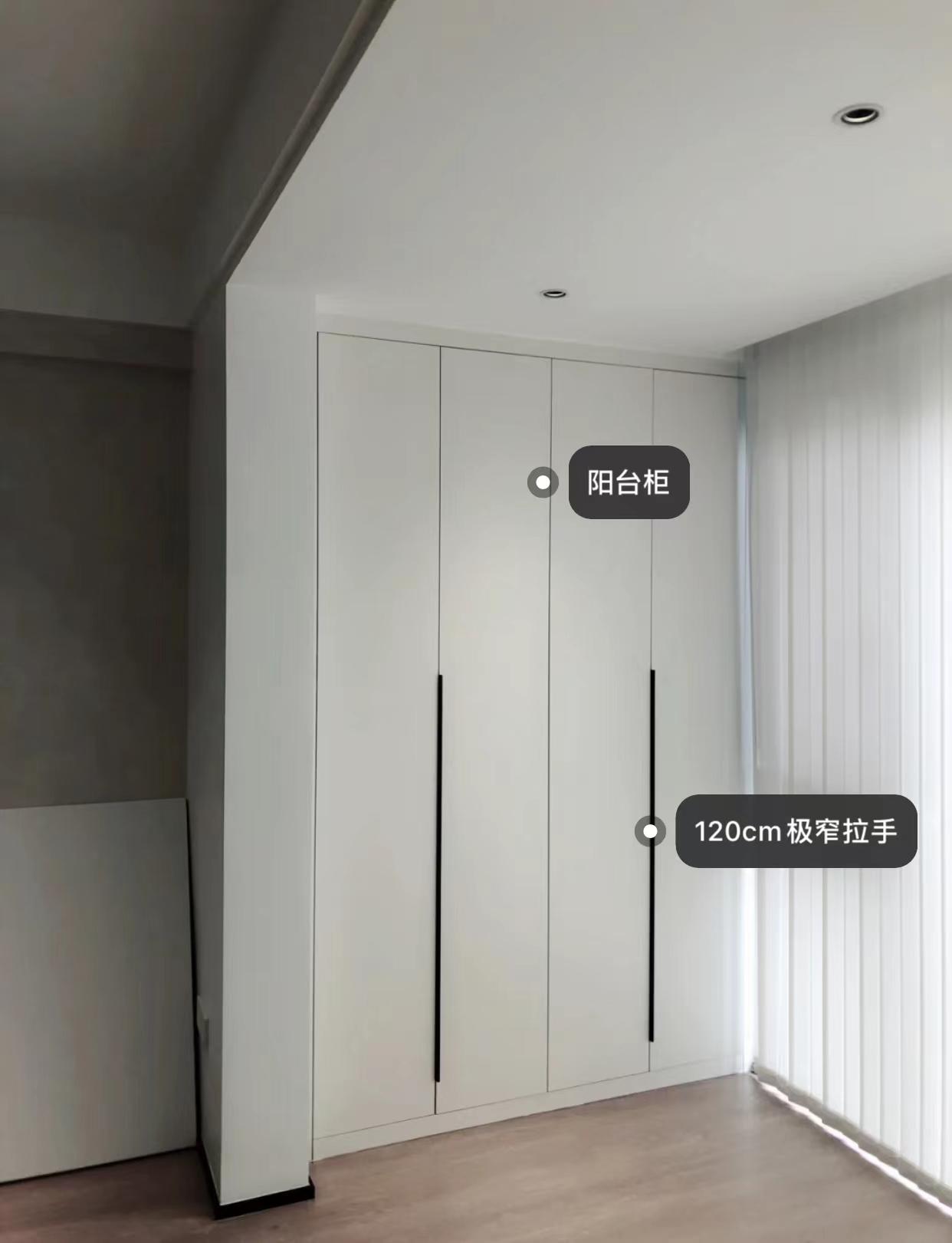 同样是极简的设计,显得整个柜子与阳台、客厅融为一体。而阳台上屋主并没有选择传统的纱窗,而是安装了70%遮光帘的百叶窗。