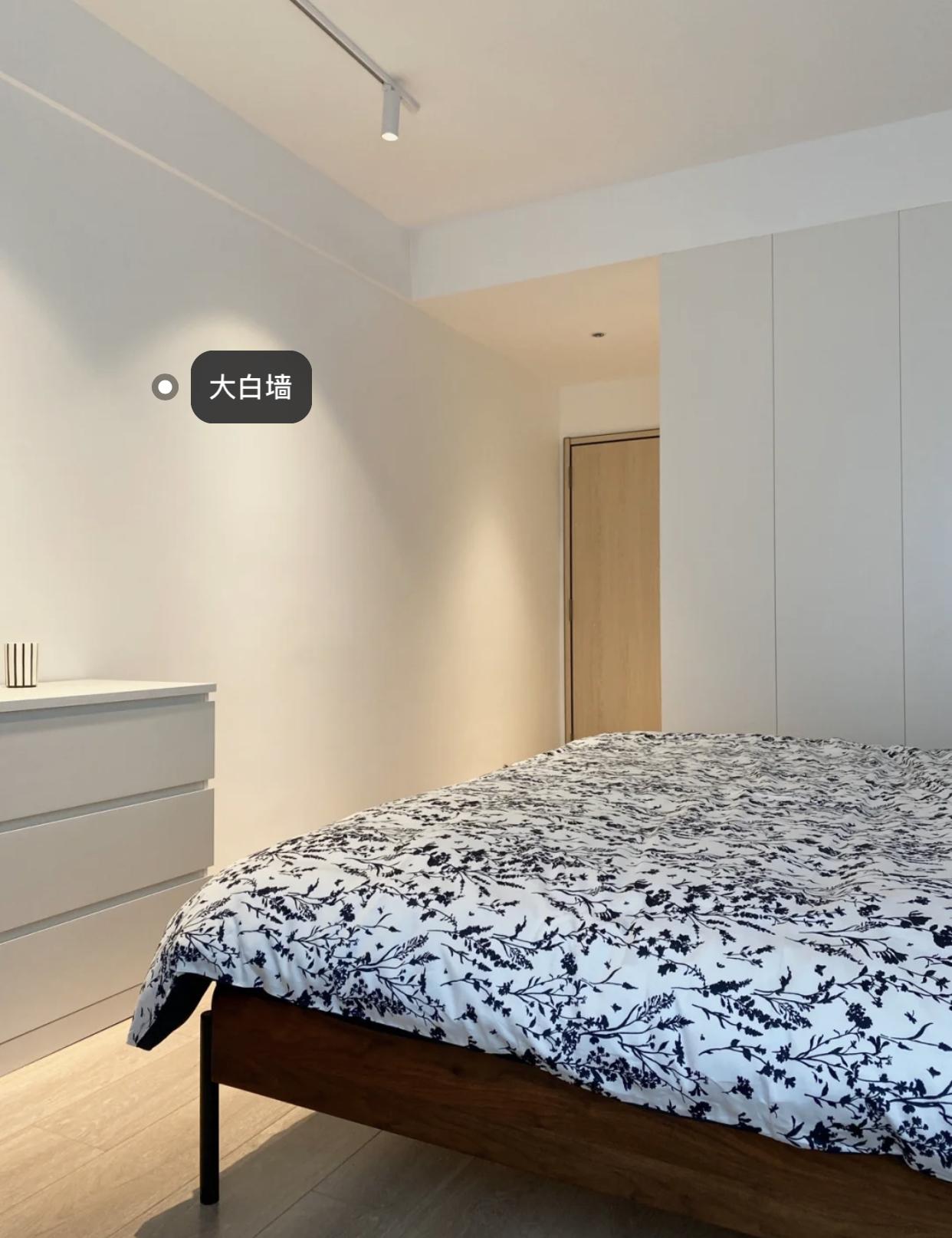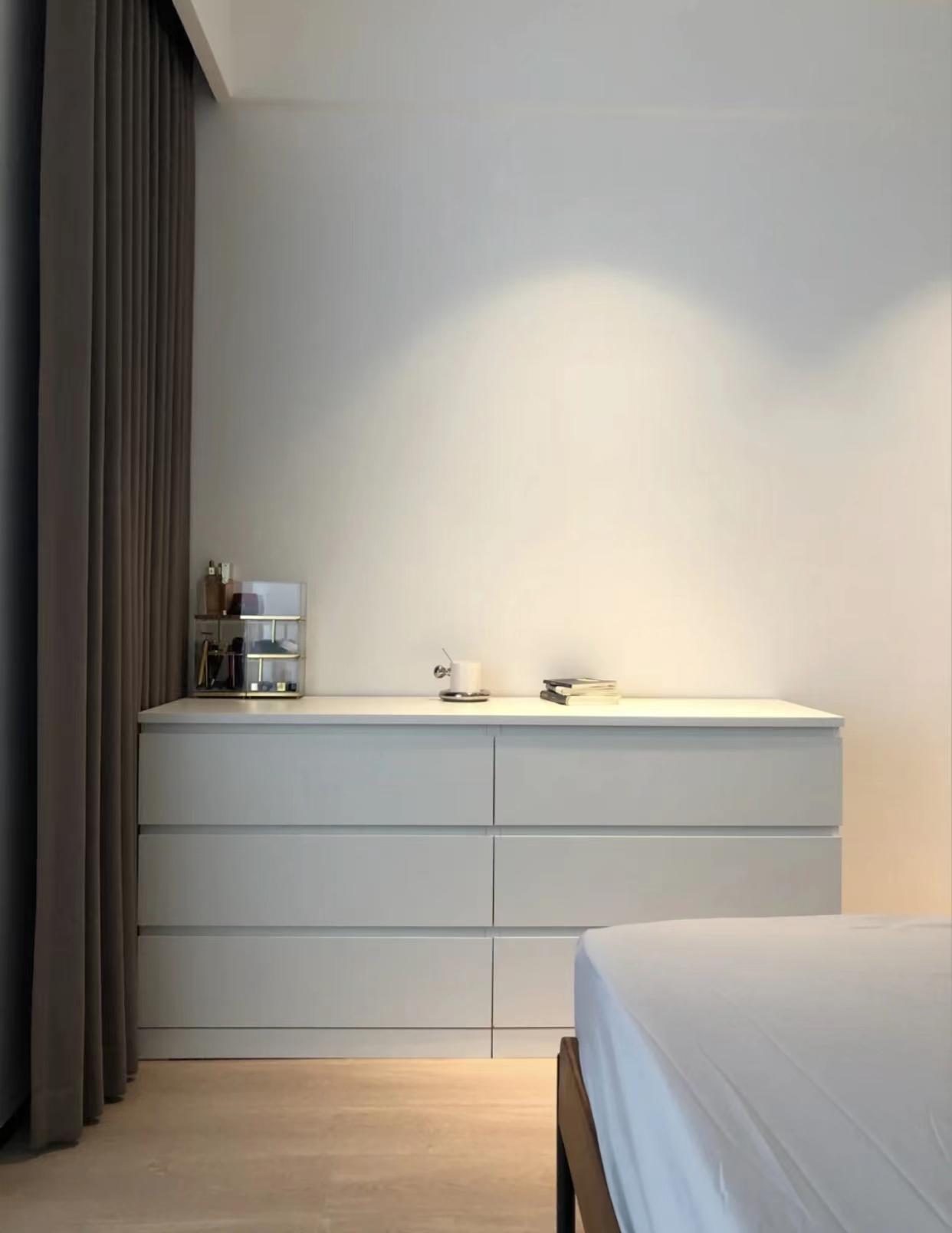 卧室与客厅一样,也没有吊顶,而且整个卧室的墙面也没有做造型,依旧是刷的白色乳胶漆。这样极简的卧室,给人的感觉就是很精致,很干净。当然也能够让人更加的放松。