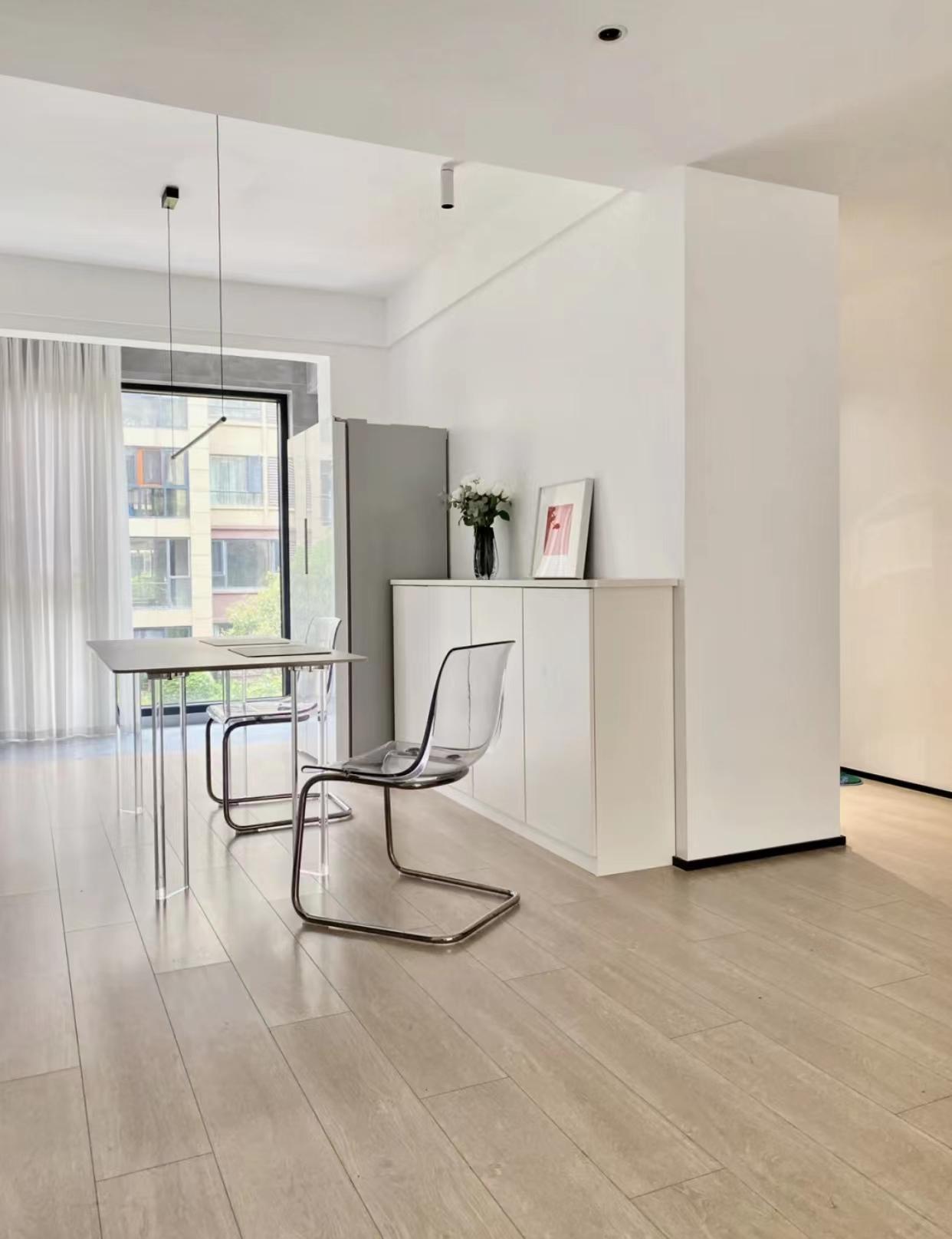 餐厅的装修依旧本着“极简”的原则设计,这一点从餐桌和餐边柜以及灯具就能看得出来。比如餐桌选择的细长腿,就连餐椅选择的也是透明款。而很多人的餐边柜一般都会有一个吊柜。但是屋主家的餐边柜,仅仅是一个地柜。相信也是为了获得更多的视觉空间。
