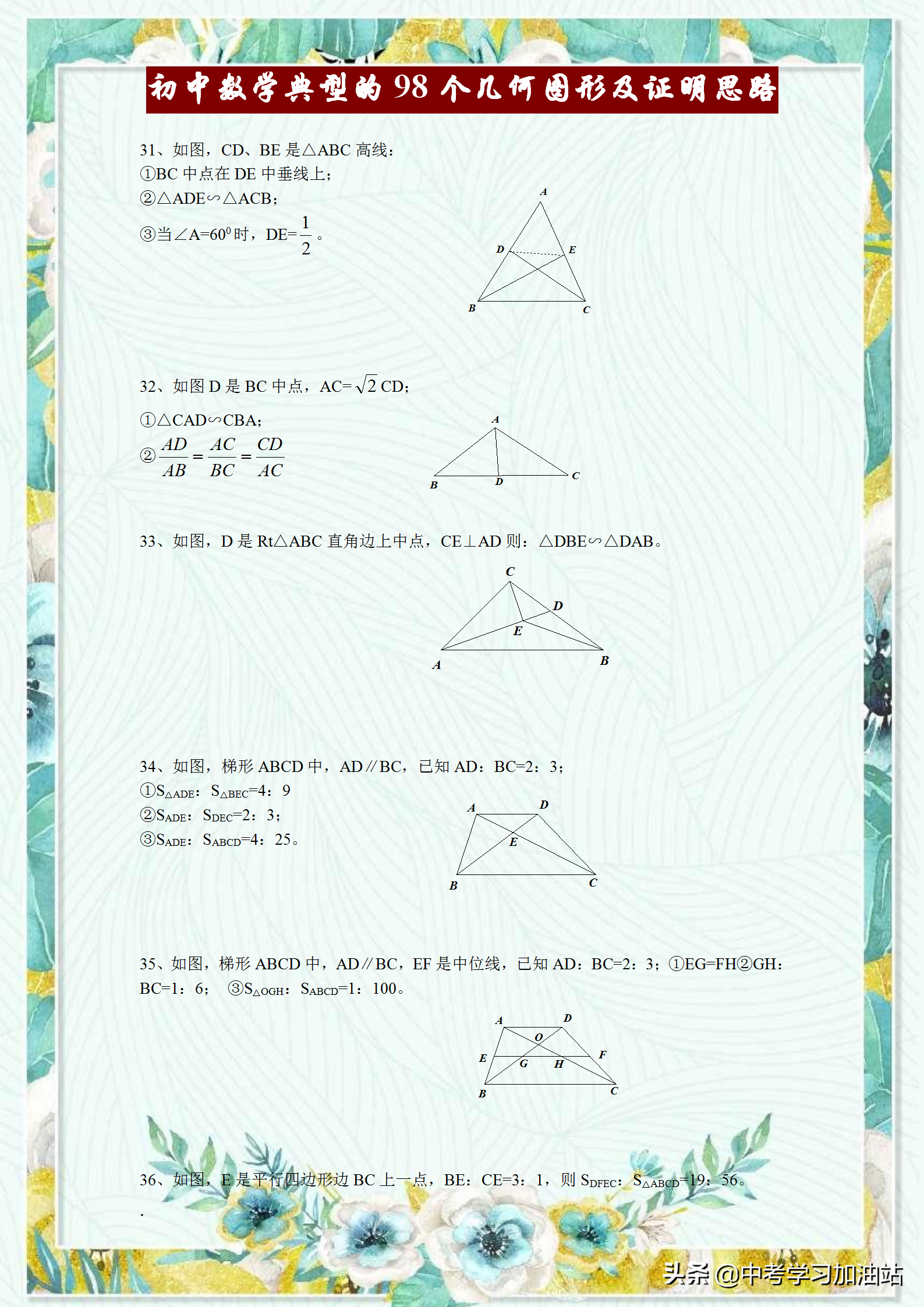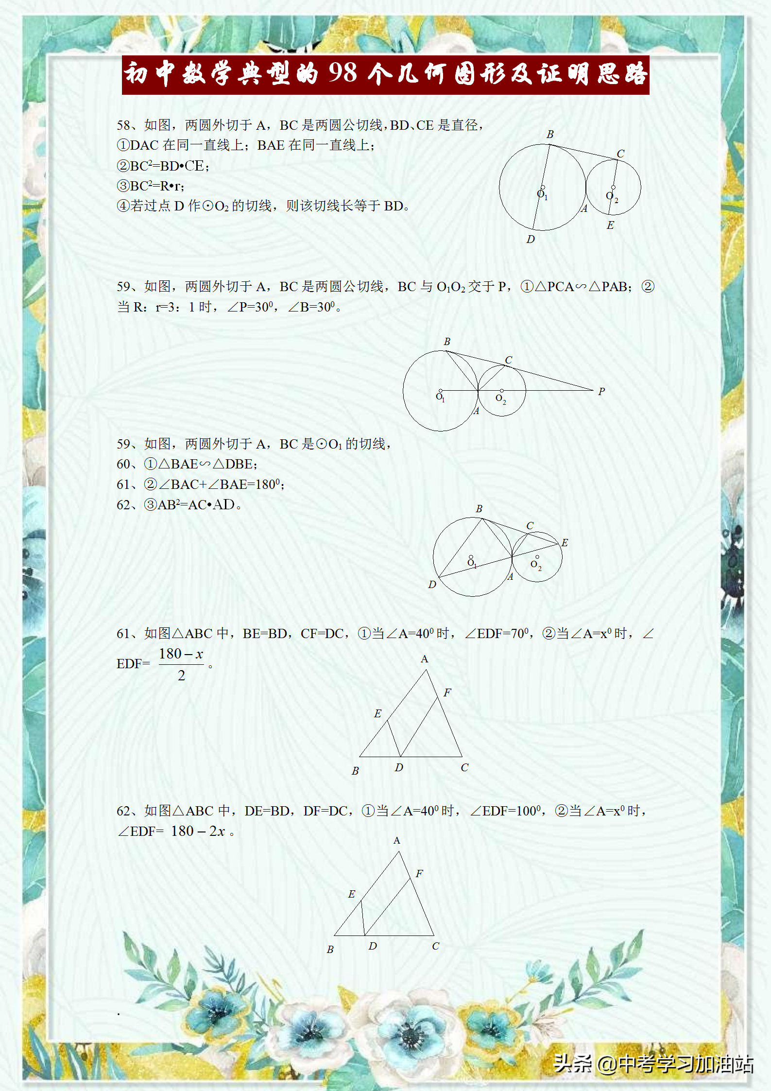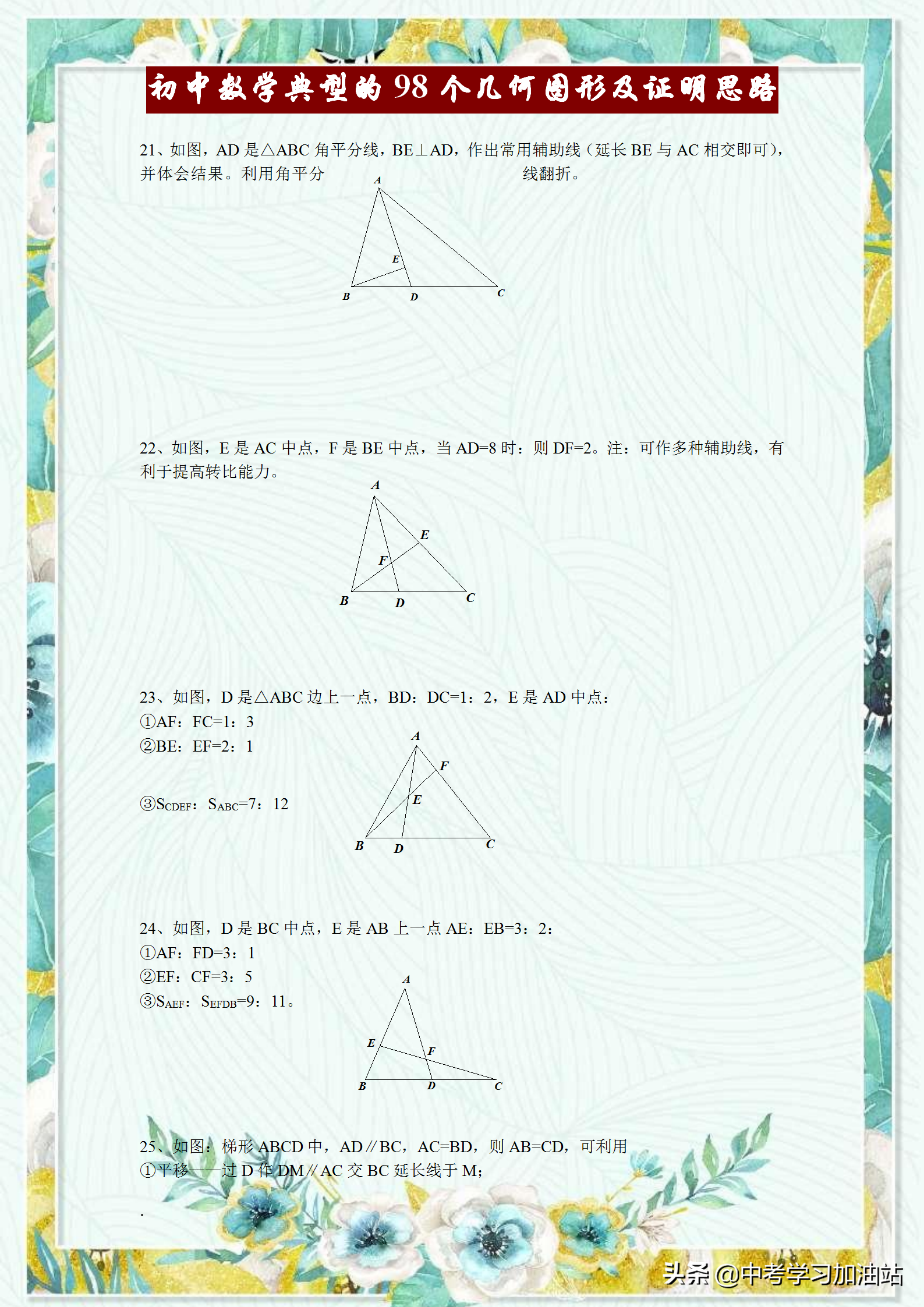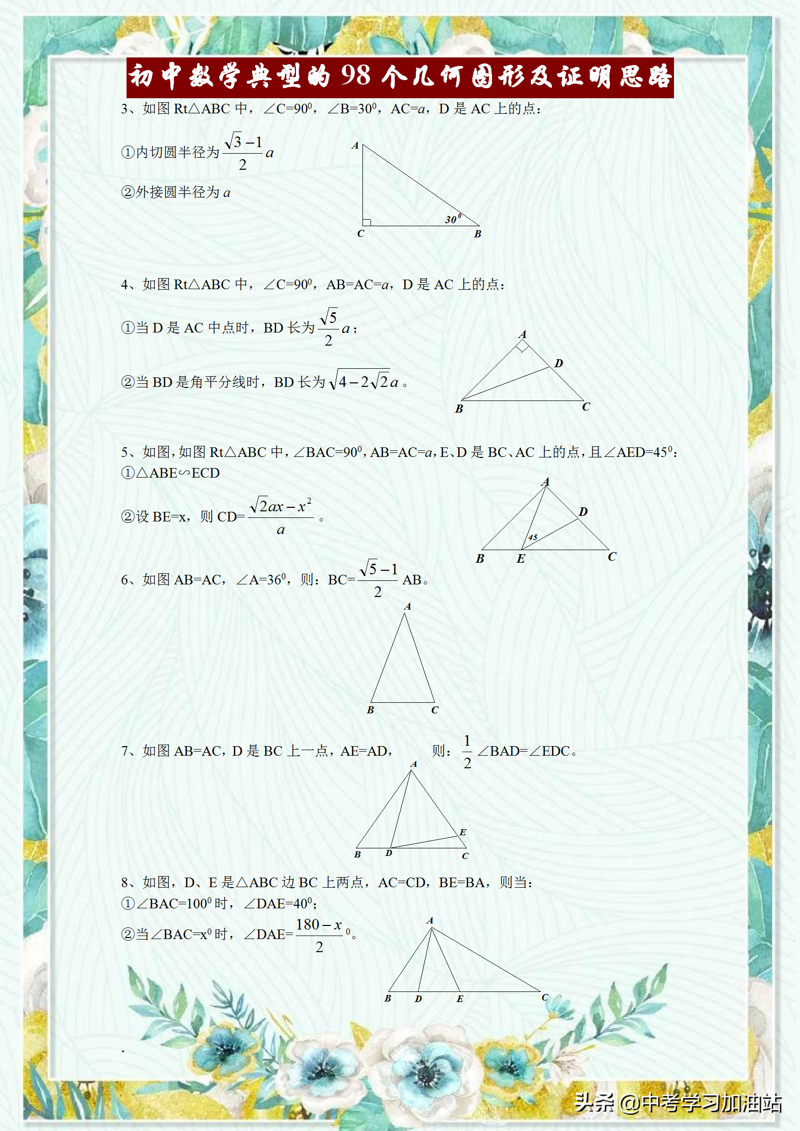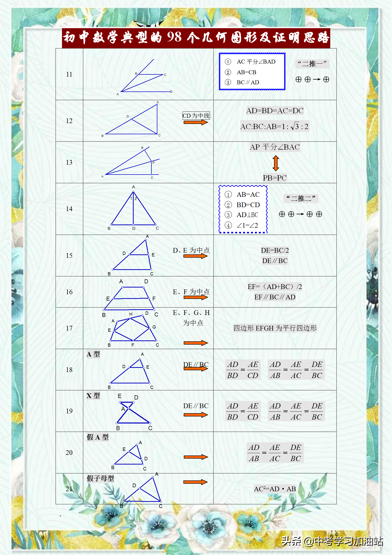 为了让大家能够更好地掌握初中几何,在此给大家分享一份初中数学常考的98个几何图形及证明思路,掌握它,几何再也不难了。