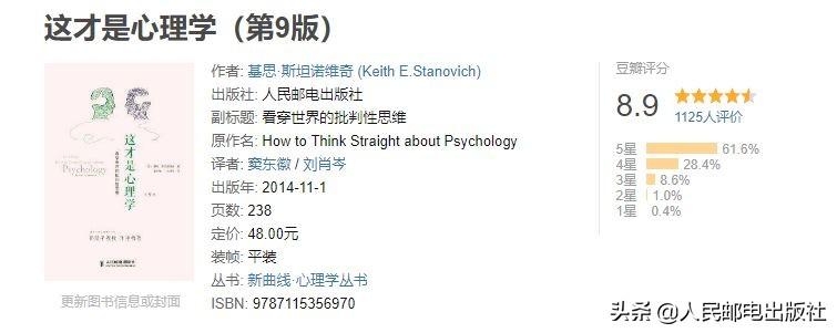 心理学入门必读,豆瓣评分8.9,首版于1983年,30多年来一直被奉为心理学入门的经典之作,作者基思·斯坦诺维奇是2012年美国心理学会终身成就奖的得主。
