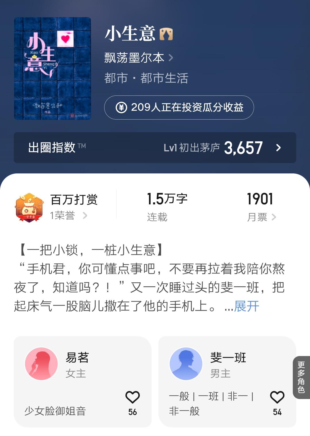 不过目前人气不太稳,因为上本小说《虚拟尽头》复刻前作失败了,准备大纲式结束。新书《我的玩家都是演技派》上线一周了,签约合同却还在路上,还是有些粗心的。