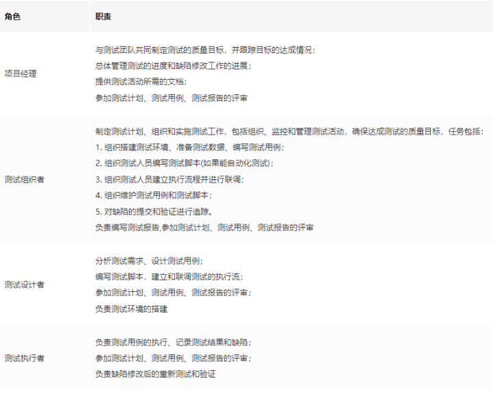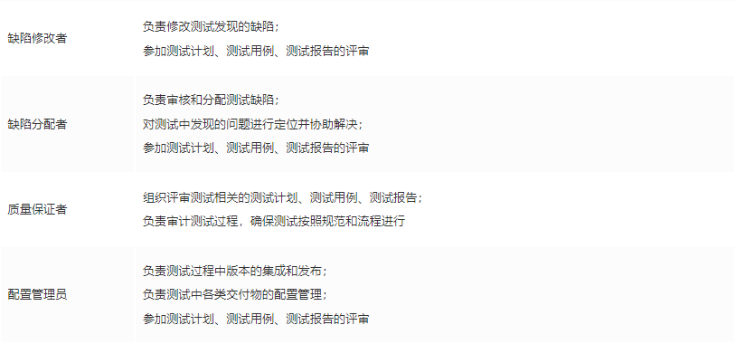 测试不是测试组一个团队的事情,需要整个项目的所有同事一起参与,测试工作所涉及的主要角色和职责大致如下: