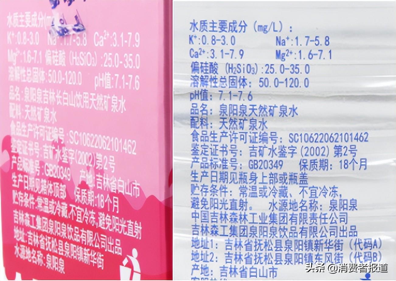 左为泉阳泉天然矿泉水(母婴专用装),右为泉阳泉天然矿泉水,两者的水质主要成分范围值完全一致,以上截图来自天猫泉阳泉旗舰店。
