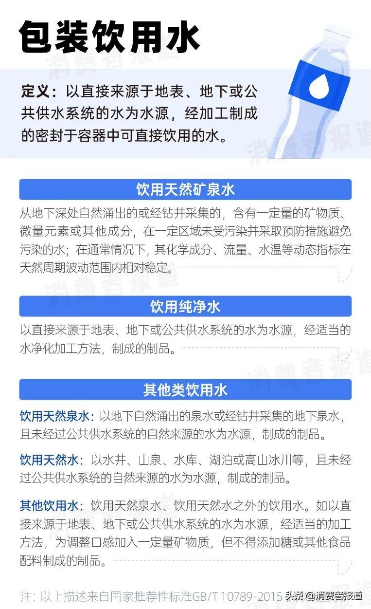 根据国家标准GB/T 10789-2015《饮料通则》的规定,包装饮用水主要有三个大类,分别是饮用天然矿泉水、饮用纯净水和其他类饮用水。