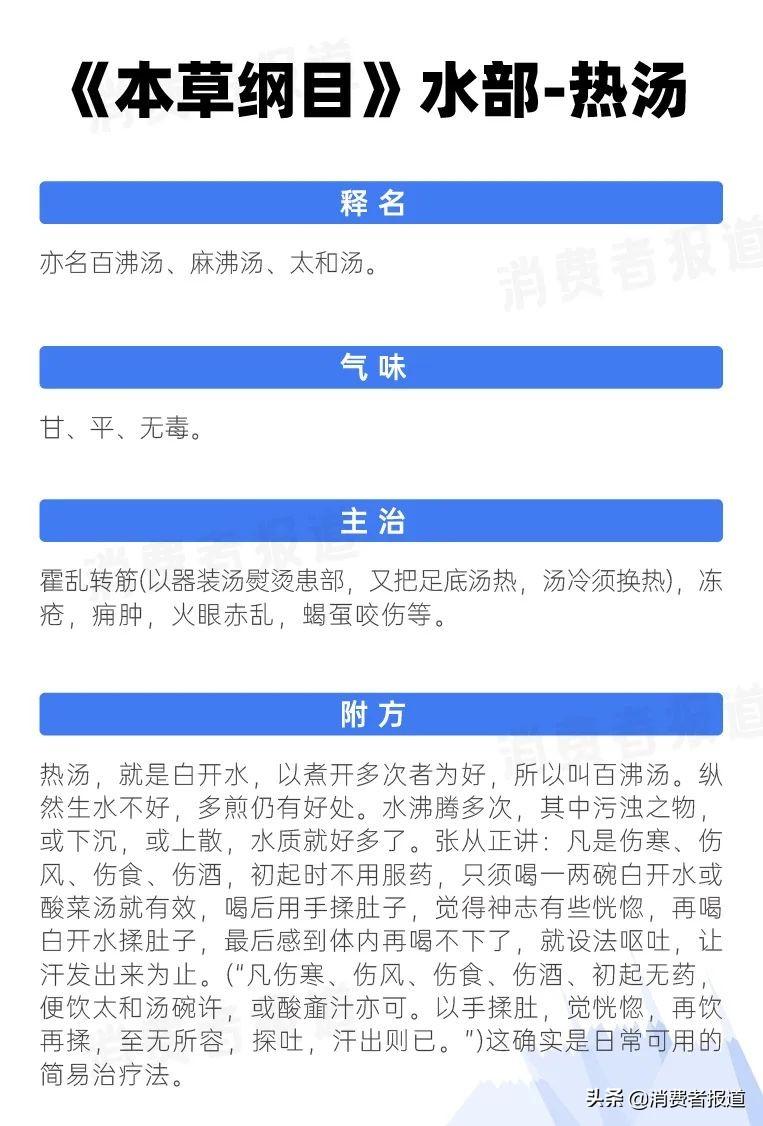 以“熟水更适合中国人”这点来说,康师傅和凉白开均提到了《本草纲目》,当中的水部记载了热汤(亦名百沸汤、麻沸汤、太和汤)。不过这仅仅是从药理的角度对白开水进行解释。而且“水沸腾多次,水质变好”也是局限于当时的饮用水处理技术。