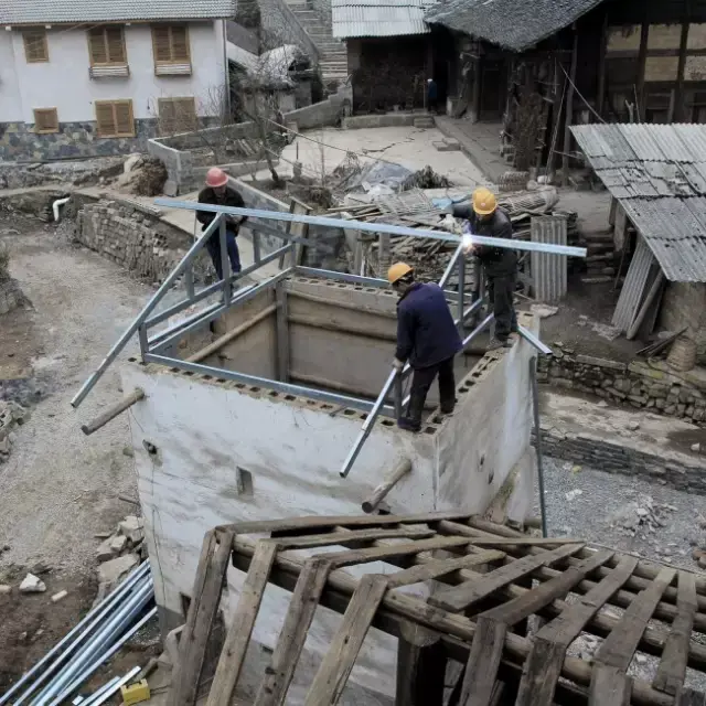 工人们将墙体拆下来的土砖替换到已经坍塌的墙体上,同时小心翼翼地拆除屋顶的瓦片,又小心翼翼地重新铺设上去。