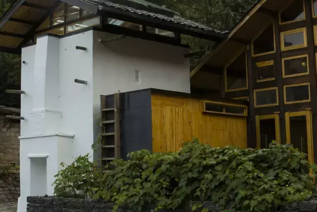 茅草的长边形成有效的屋顶防水系统,又能保持呼吸性,气流可以加速吹干茅草,防止腐烂和蛀虫。鸡舍同样是纯天然的竹构建筑,底部由木栅构成。五间亭由五个小间组成,可供游人休息喝茶。
