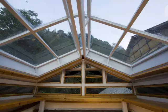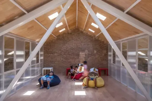 为解决采光通风问题将原有石棉瓦屋面拆除,改为钢结构屋架。整个屋面在原基础上整体抬升,在屋面与墙体间形成一圈带状窗户。屋面上方设置了玻璃天窗,原本黑暗的室内变得阳光充裕且富有浪漫气息。