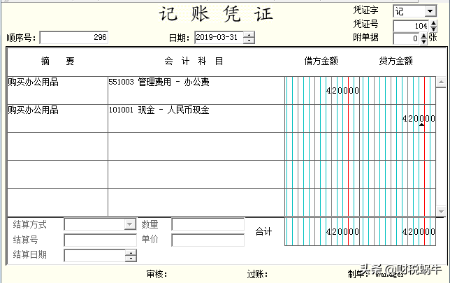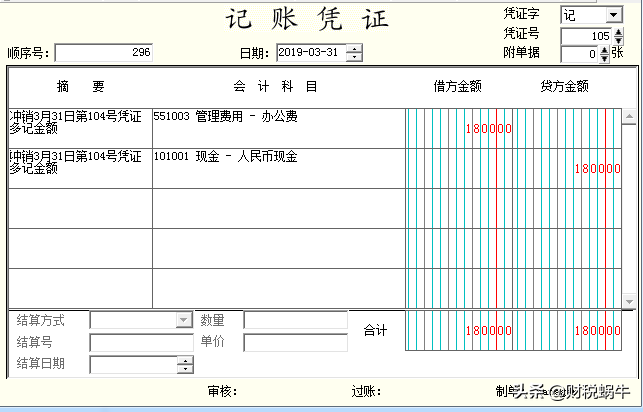 记账金额大于实际金额,使用红字更正法冲销多记金额1800.摘要栏填写“冲销3月31日104号凭证多记金额”凭证如图所示:
