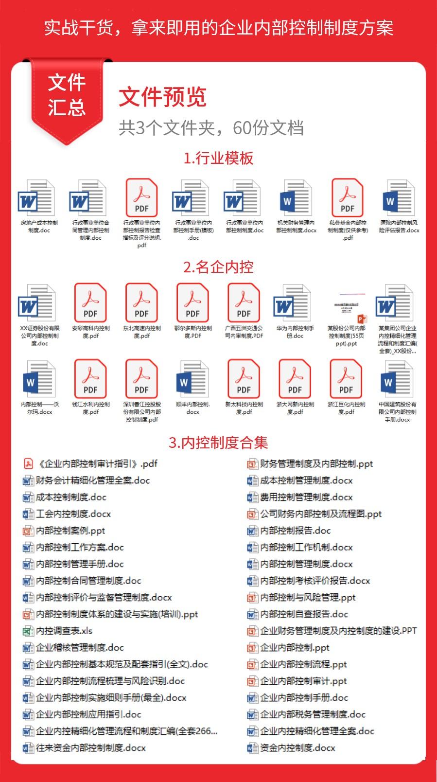 本期专题是《内部控制制度手册》,60套内控干货资料,涵盖模板、制度、流程、规范、调查表、案例分析、内控报告、名企内控资料、管理手册等。