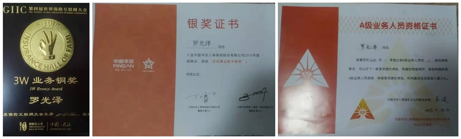 罗光泽在朋友的介绍下进入保险行业,凭借着坚韧的学习能力和积极乐观进取精神在短短时间获得平安展业能手称号、 钻石会员、互联网保险3W奖等众多荣誉。