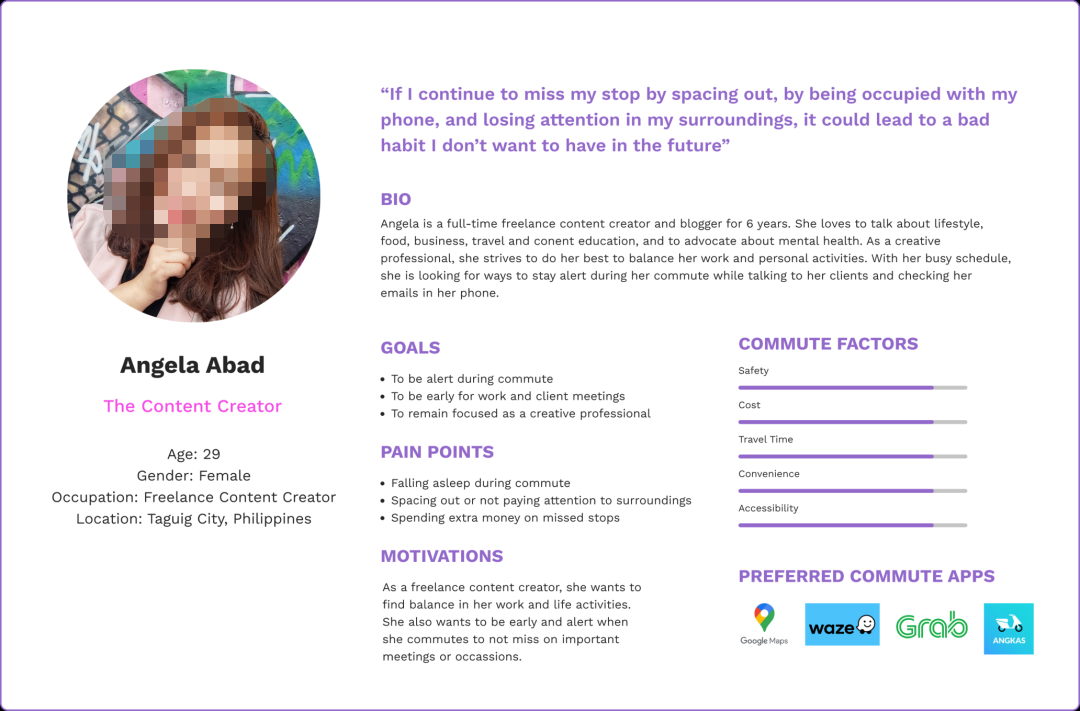 团队列出了每个用户角色的用户目标、需求、痛点、通勤因素的重要性,以及他们喜欢的通勤或导航应用程序。