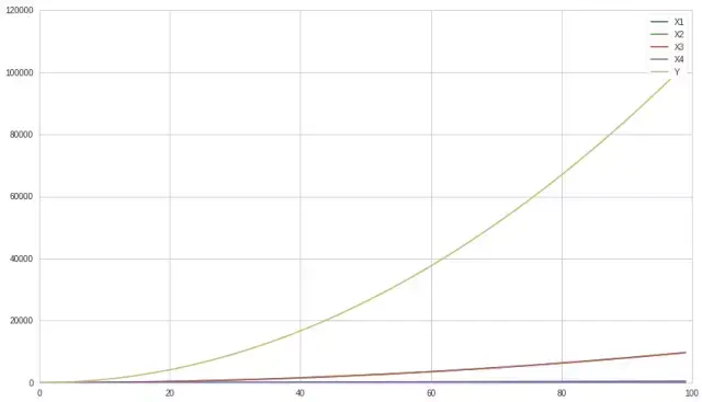 随后我们在各自变量之间设定一些关系,特别对于自变量X4,将其设置为与X1严格线性关系( = 5X1),具体如下: