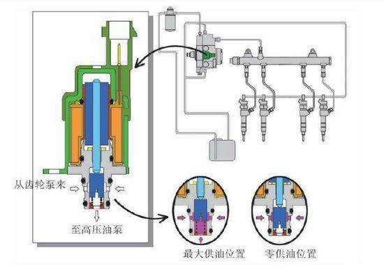 当没有通电时,阀芯处于常开位置,也就是位于最大供油位置。只有在接通电源之后,ECU才通过脉冲信号改变计量单元内部的占空比,来控制进入高压油泵柱塞的燃油量,从而控制共轨管内的燃油压力值,再保证发动机可以良好运行。
