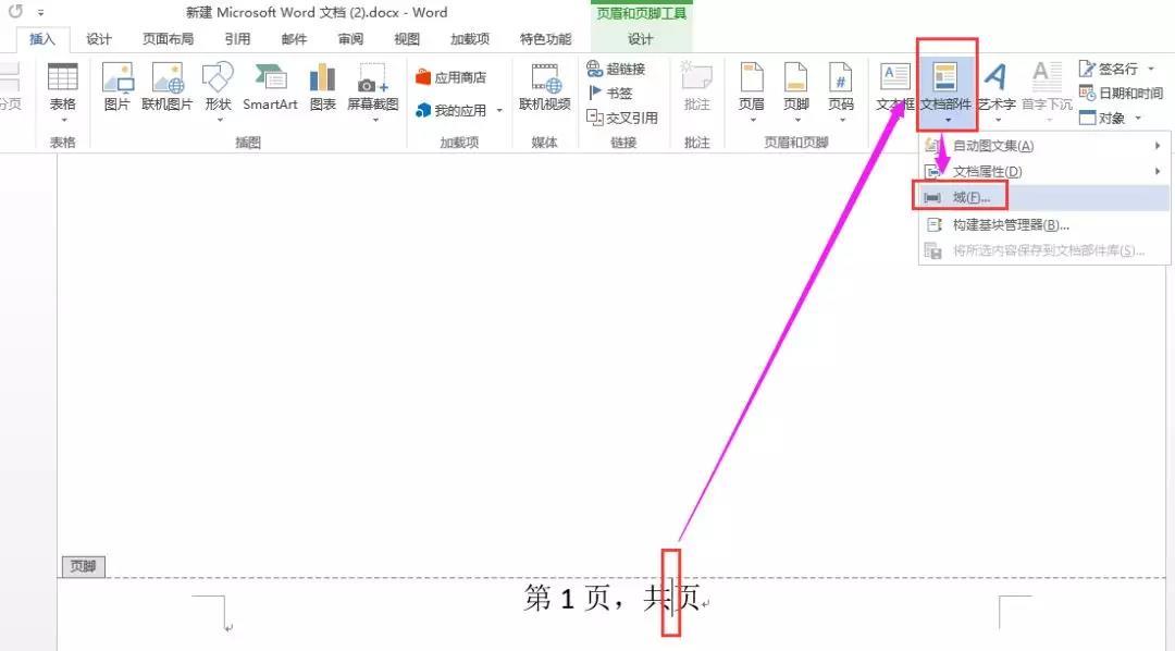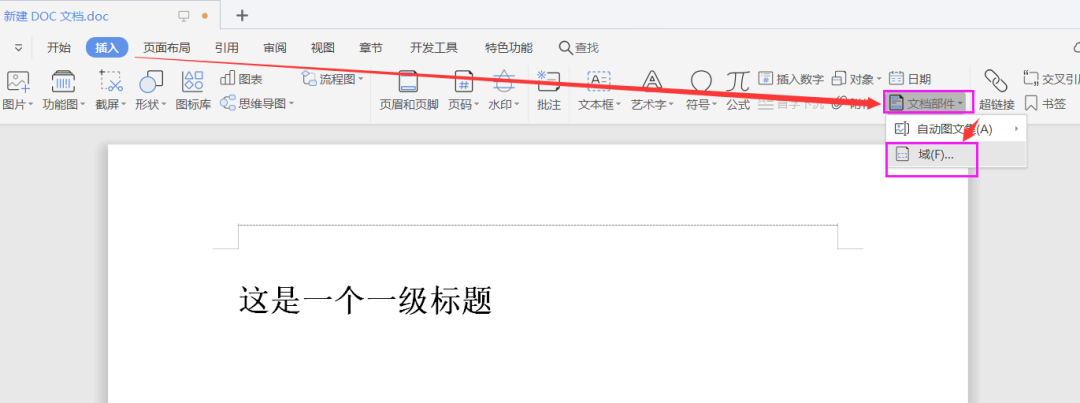 第三步:完成分页符的插入后,继续选择需要设置目录的页面,点击“插入”下的“文档部件”,选择旗下的“域”,具体如下图所示: