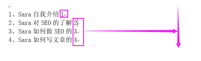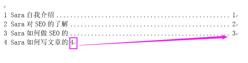 第三步:在第二步中设置好以后,就关闭制表符的设置。这时候,只要在目录页数的数字前敲“tab”键,就会看到神奇的一幕啦~如此重复此步骤直到将所有目录页数对齐。