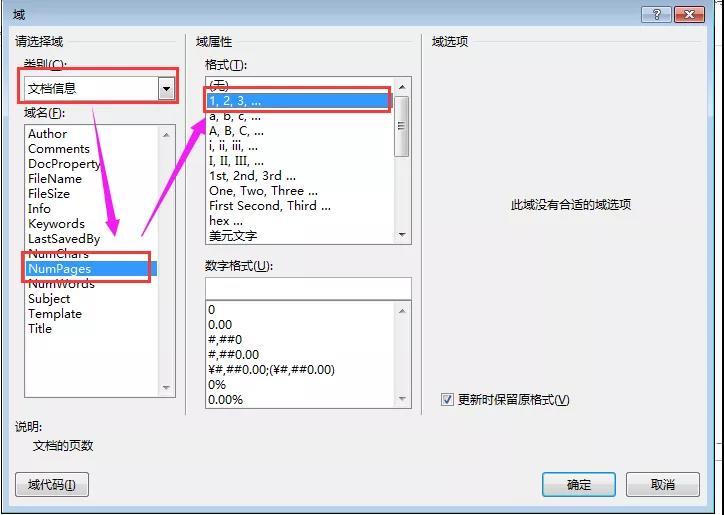 第四步:在“域”中,类别选择“文档信息”,域名选择“NumberPages”,格式选择普通的数字“123”,如下图操作步骤所示: