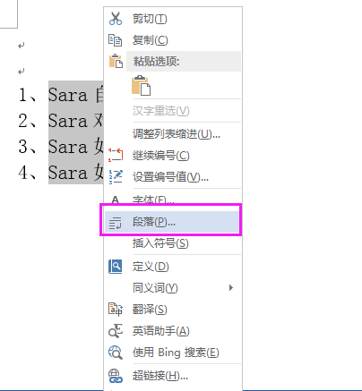 第一步:选中需要设置目录的文字,右键,调出“段落”,点击: