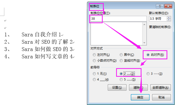 第二步:在“段落”中的左下角位置找到“制表位”,将制表位位置调整至“38”,选中“右对齐”,前导符选中数字“2”的那一栏,点击确定。