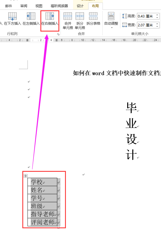 第二步:单击“布局”中的“自动调整”,选中“根据内容调整表格”一栏。最后单击两下“在右侧插入”,就会生成三栏表格啦。