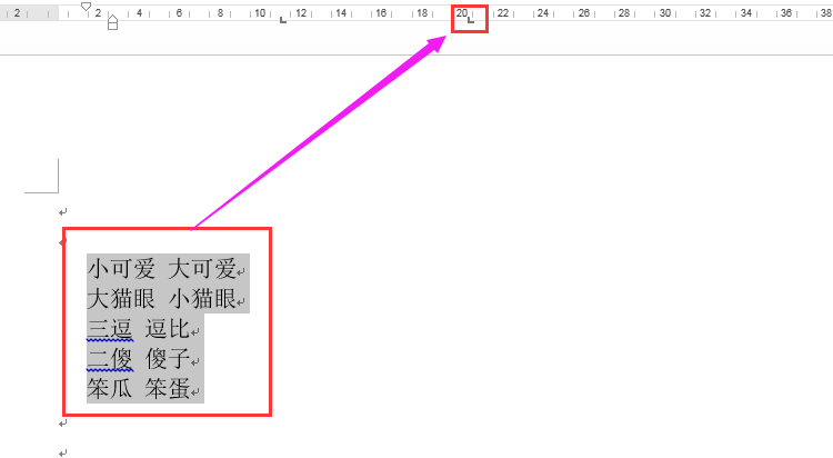 第一步:选中需要调整的数据,在标尺上添加一个“左对齐”的制表符。(温馨提示:“标尺”是在Word文档里的“视图”中找到;制表符的位置是由自己选择的,如图所示,Sara选择了“11”和“20”两个制表符,用于给大家展示。)