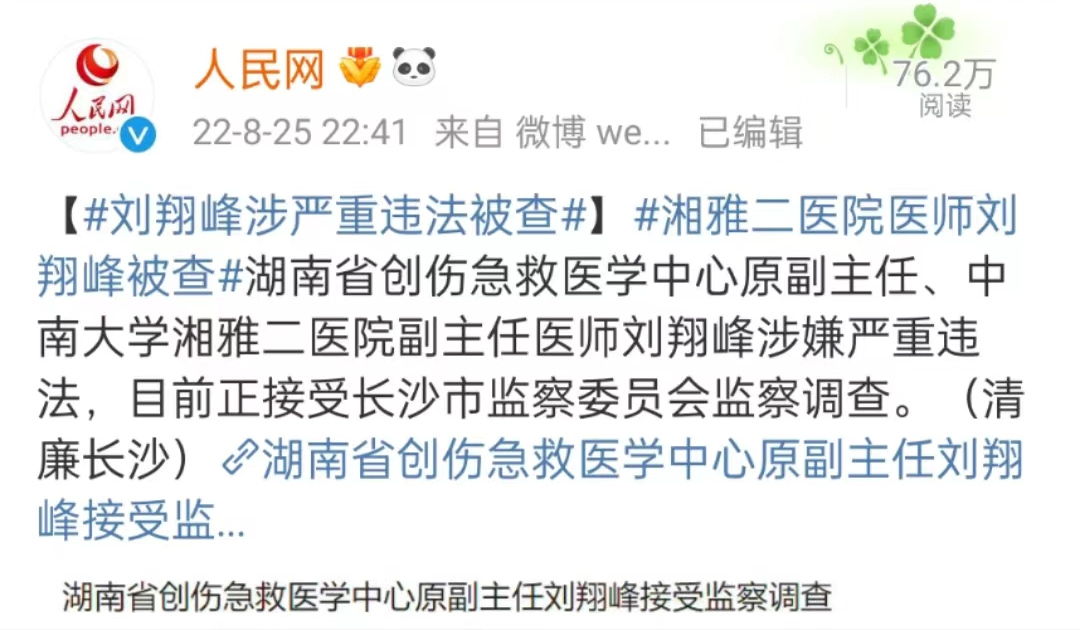 对于刘翔峰的问题,湘雅二院初步调查发现,刘翔峰在医疗过程中存在不规范行为,并在第一时间免去了刘翔峰湖南省创伤急救中心副主任职务,停止其处方权及手术权限。