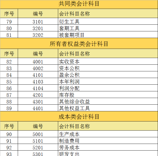 共同类、所有者权益类及成本类