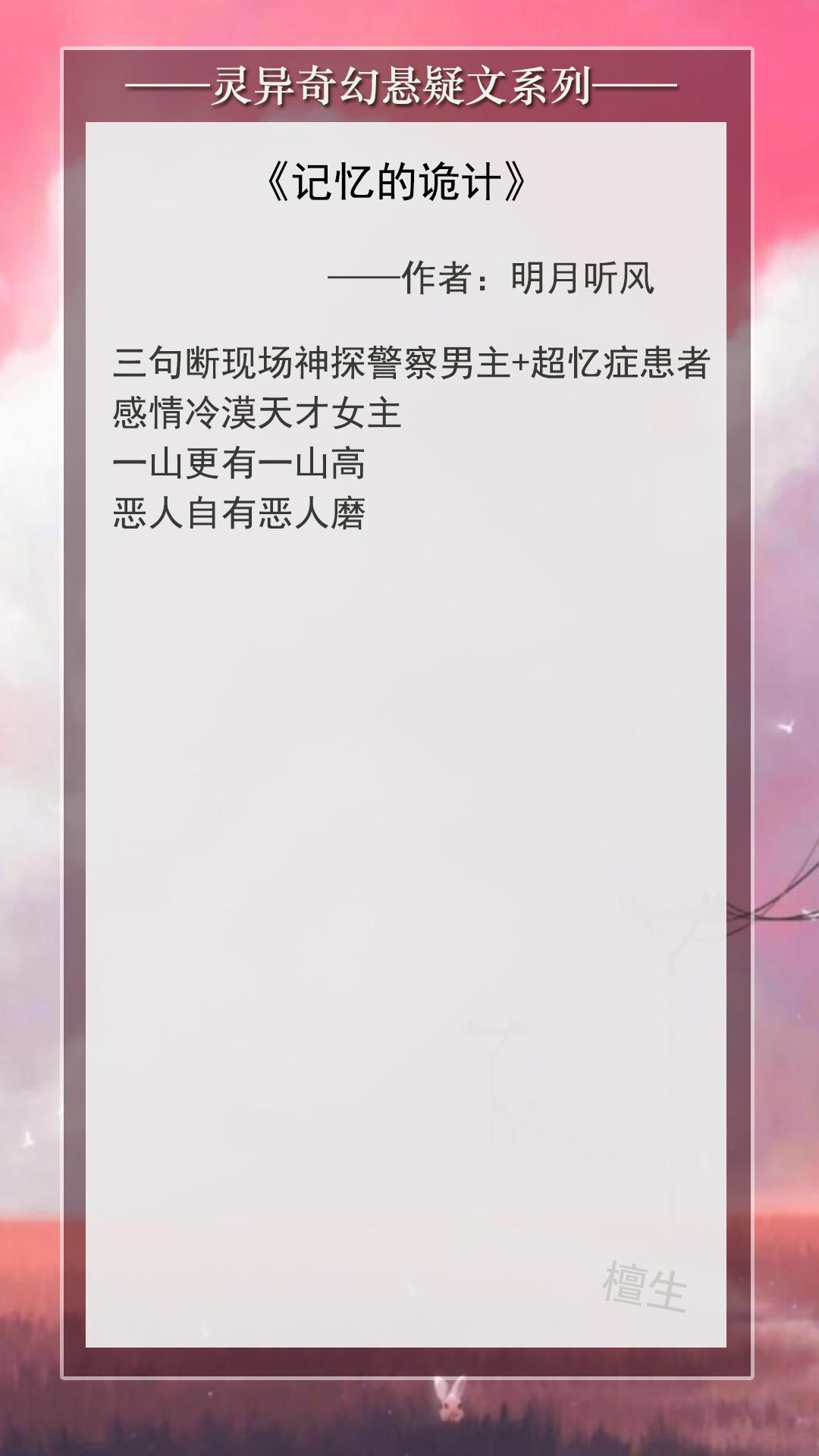 这篇文的优点是设定新颖,文风简练有条理,每个案子都有自己的脉络和逻辑,副本像剧本杀,读起来挺带感的。缺点是男女主角的形象过于扁平,类似工具人提供视角穿针引线走剧情,让人感受不到他们的独特魅力之处。