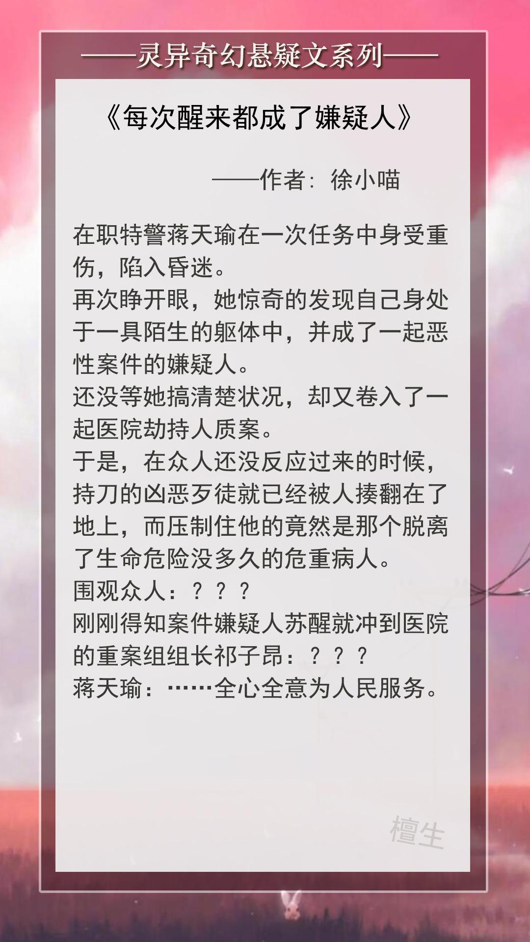 简评:女主蒋天瑜是特警,为人机智冷静,可盐可甜战斗力爆棚。一次意外受伤陷入昏迷之中,导致灵魂出窍附身在凶案嫌疑人身上,每次醒来她都要去相关场景激活记忆,找到线索来证明自己的清白。还站在嫌疑人的视角协助警方一起调查真相,找到真正的凶手。男主祁子昂是重案组组长,外表是粗犷风的型男,为人却十分严谨,心思缜密,观察力满分。他经手这些案件,看出端倪识破女主的身份,和她简直是天命搭档,配合默契无间,一共八个案子,环环相扣,携手破解了终极大案,两人的感情也水到渠成。