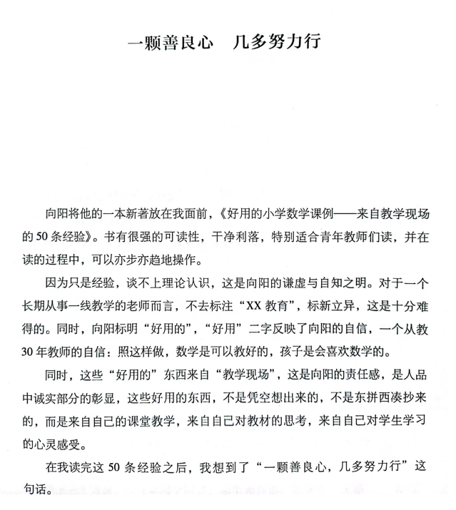 我很荣幸拜读了朱向阳老师撰写的《好用的小学数学课例——来自教学现场的50条经验》书稿。书稿中的一个个鲜活案例剖析可以深刻感受到一线教师是如何去解读教材的;可以深刻地理解到教学设计以生为本是如何落实的;可以深刻体会到课堂中促进学生进行深度学习是如何实现的;书稿中也深刻地领悟到一线老师的教学反思是如何完成的;更能深刻地顿悟到一名教师从优秀走向卓越是如何修炼出来的......