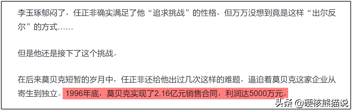 要知道华为几乎占到莫贝克全部的销售额,没了华为,莫贝克就是完全没有了靠山,此时的莫贝克才感受到,任正非是对他们动真格了,目的就是要他们自食其力!