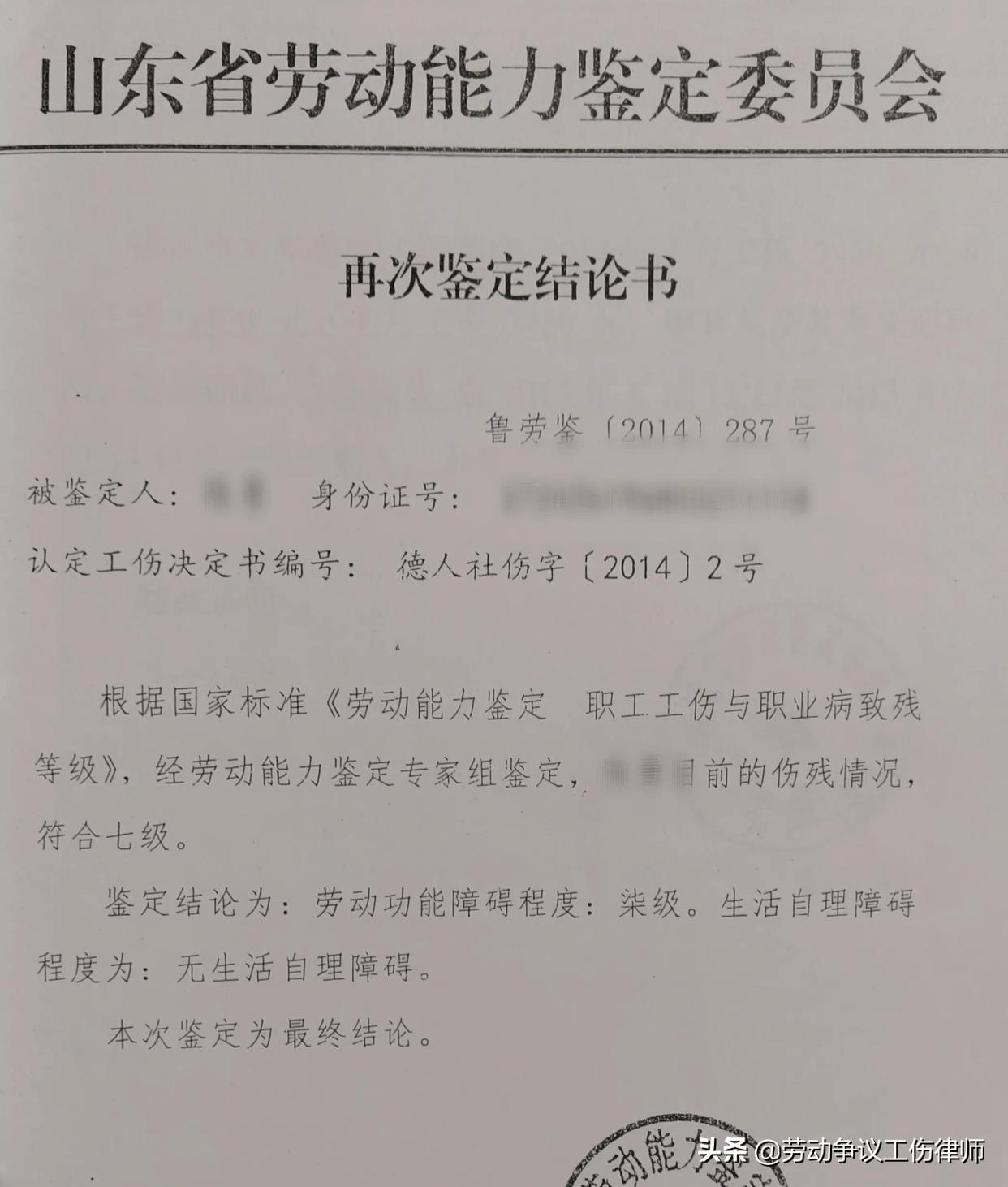 职工初次伤残等级是八级,在这种情况下大多数额当事人或律师会认可伤残等级然后申请劳动仲裁要求赔偿,我拿到鉴定后看伤残等级鉴定低,建议职工向省劳动能力鉴定委员会申请再次鉴定,争取提高伤残等级。这就是在动态中发现问题处理问题,最后省劳动能力鉴定委会作出鉴定结论伤残等级是七级,比原来提高了一级,这一项就可以多赔好几万。工伤待遇21万。