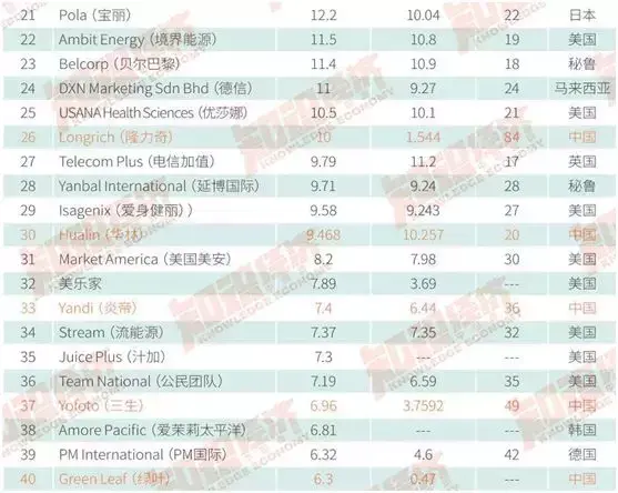 除此之外,3家韩国直企、5家美国直企、1家日本直企、1家新加坡直企、1家马来西亚直企第一次入榜,而绿叶、天福天美仕、铸源、康美、北方大陆等5家中国直销企业初次进入100强榜单。