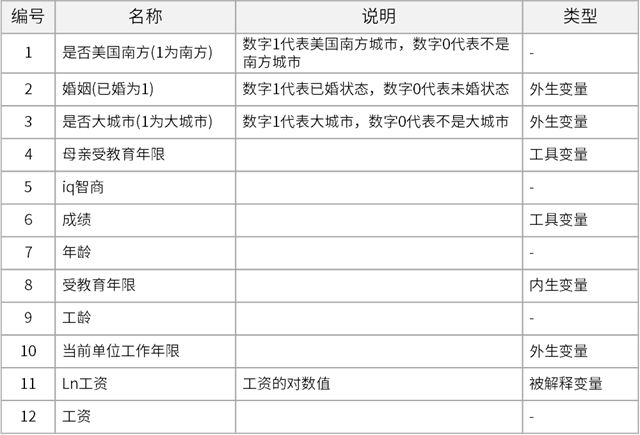 本案例引入Mincer(1958)关于工资与受教育年限研究的数据。案例数据中包括以下信息,如下表格: