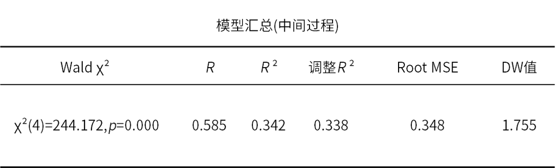 上表格展示模型的基础指标值,包括模型有效检验wald卡方值(此处提供wald卡方非F检验),R值,Root MSE等指标值。