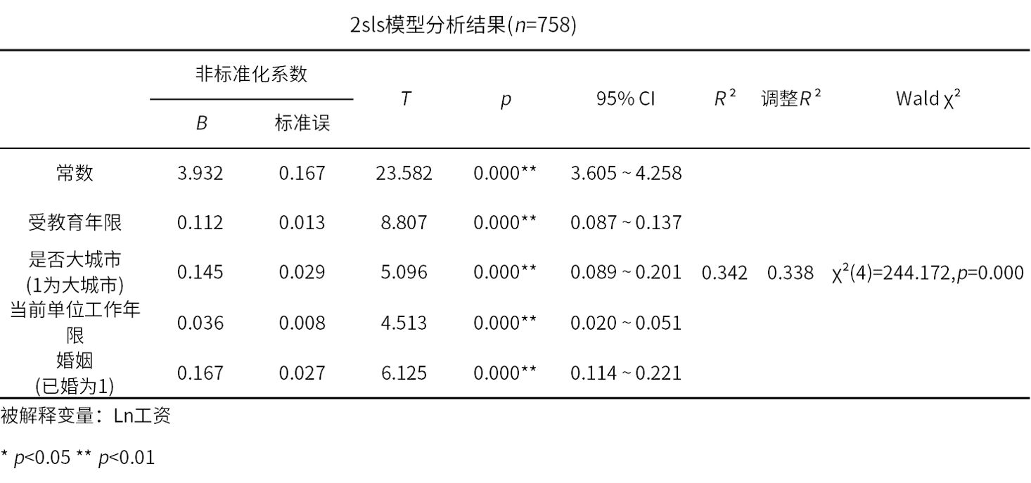 上表格列出TSLS两阶段最小二乘回归的最终结果(第二阶段结果),首先模型通过Wald 卡方检验(Wald χ² =244.172,p=0.000<0.05),意味着模型有效。同时R方值为0.342,意味着内生和外生变量对于工资的解释力度为34.2%。具体查看内生和外生变量对于被解释变量‘工资’的影响情况来看:
