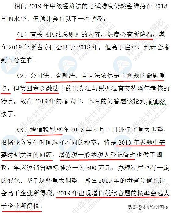 预计2019年中级《经济法》的考试难度仍然会维持在2018年水平。有关《民法准则》的内容,热度会有所降温。公司法、金融法、合同法依然是主观题的命题重点。增值税税率及增值税一般纳税人登记管理等方面,希望考生时刻关注,引起重视。