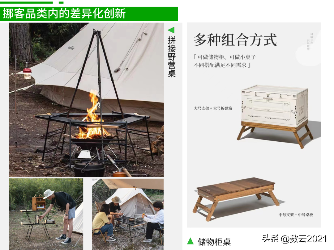 因此,挪客会从材质、尺寸、重量、承重、适用场景等维度对单品进行再设计,从需求创造的层面带动购买率。如同样是户外折叠桌,都侧重多功能这一卖点,有既可做储物柜又可当小桌子的收纳箱桌,也有强调多种拼接方式的野营桌。