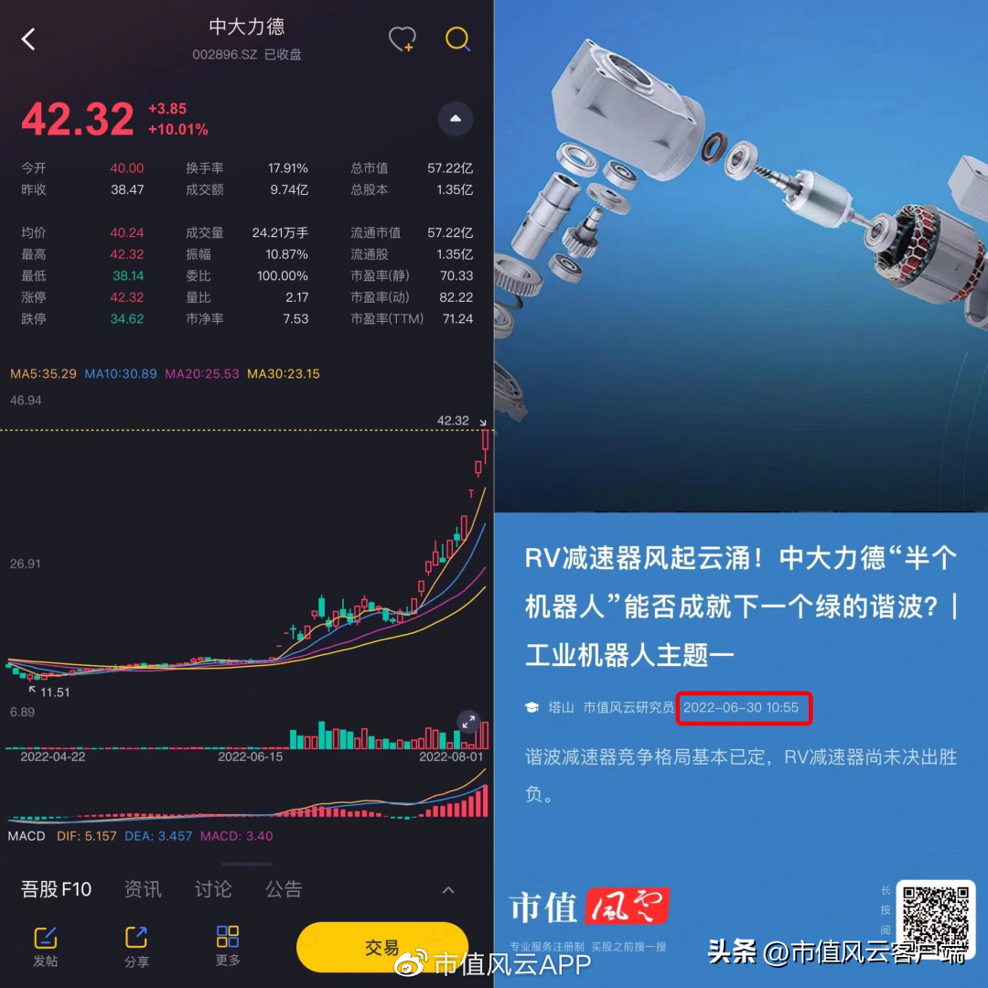 风云君在上期给大家分享过精密减速器行业上市公司中大力德,详情请下载市值风云APP查看。