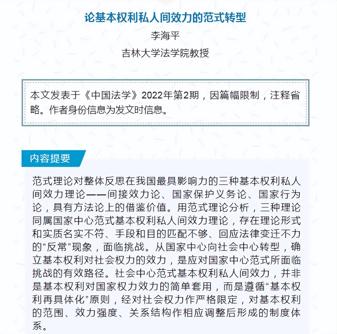 近日,吉林大学法学院李海平教授在《中国法学》2022年第2期发表题为《论基本权利私人间效力的范式转型》的原创性成果。文章系统阐述了基本权利对社会权力效力的理论,对于深化基本权利私人间效力理论研究具有一定意义。