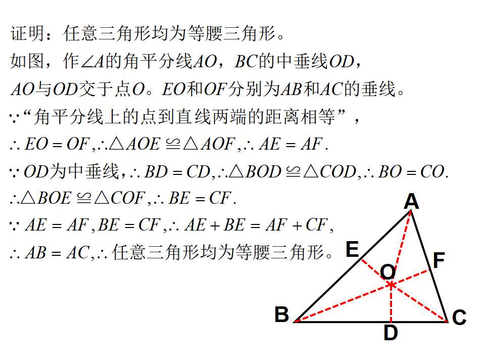 事实上上面的证明过程没有错误,而真正错误的是上面的图,平分线和中垂线的交点O并不在三角形内部。